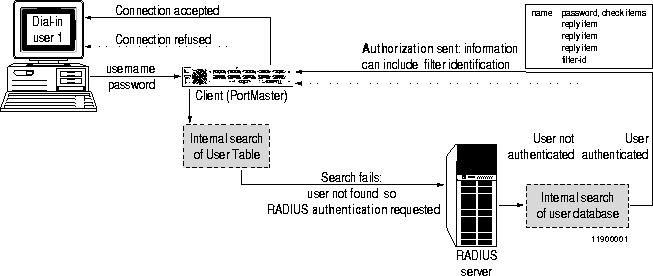 If the user is not found in the User Table, the PortMaster requests the RADIUS server to authenticate the user. The RADIUS server searches its user database. If it does not find the user entry for the dial-in user, or if the password for the user does not match, the RADIUS server sends a message to the PortMaster to reject the connection.