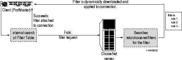 If a filter is not found in the Filter Table, the PortMaster sends a request to the ChoiceNet server to download the filter. The ChoiceNet server searches the /etc/choicenet/filters directory. If it finds the filter, the server downloads the filter to the PortMaster, where it is applied to the connection. This operation is called a dynamic filter download.