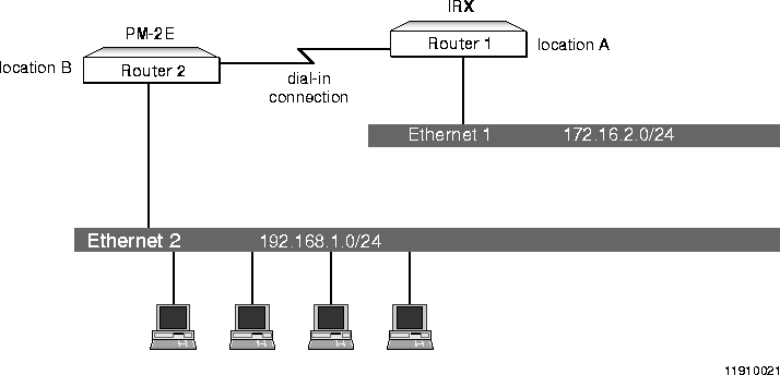 To make this connection possible, Router 2 must be configured so that hosts on Ethernet 2 can access the Internet via a dial-in PPP connection from Router 2 to Router 1, and Router 1 must be configured to accept a dial-in modem connection from Router 2.